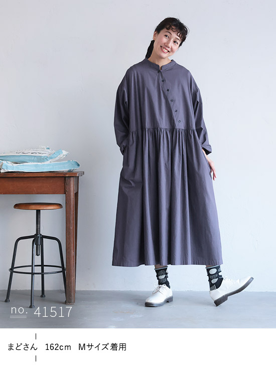 [me] 私のななめボタンなワンピース レディース ロング 長袖 フレア Aライン アシンメトリー 綿 コットン