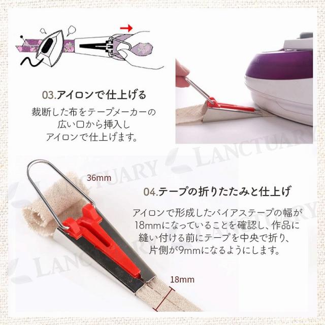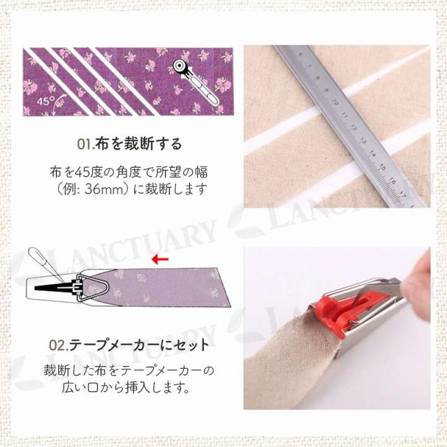 使用方法はシンプル:適切な幅に布をカットし、メーカーに通してアイロンでプレスするだけ。このセットで、6mmから25mmまでの任意の幅のテープを自由に作ることができ、手作りの作品に特別なタッチを加えられます。頑丈な金属製で、繰り返しの使用に耐える耐久性を備えています。