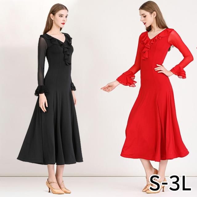 社交ダンスドレス モダンドレス 黒 赤 社交ダンス衣装 社交ダンス ドレス 衣装 長袖 大きい裾 スタンダードドレス ワルツダンス ワンピースドレス ステージ衣装 ダンス衣装 ダンスウェア 競技会 パーティー 発表会 競技着 練習着 舞台 演奏会 演出 ブラック レッド d1325d7d7z7