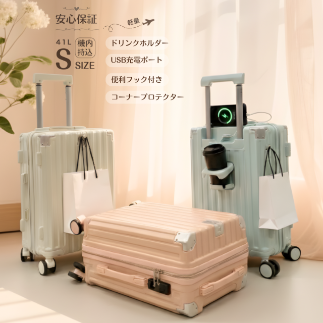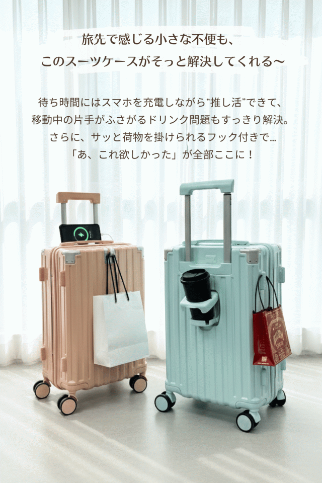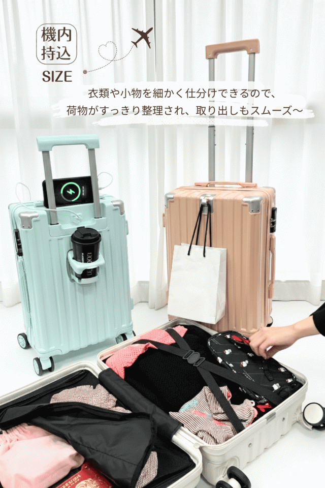 スーツケース キャリーケース 機内持ち込み ワンタッチオープン フロントオープン 前開き 軽量 キャリーバッグ TSAロック 充電ポート ドリンクホルダー カップホルダー スマホスタンド 荷物掛けフック 360度回転キャスター キャリーバッグ かわいい おしゃれ