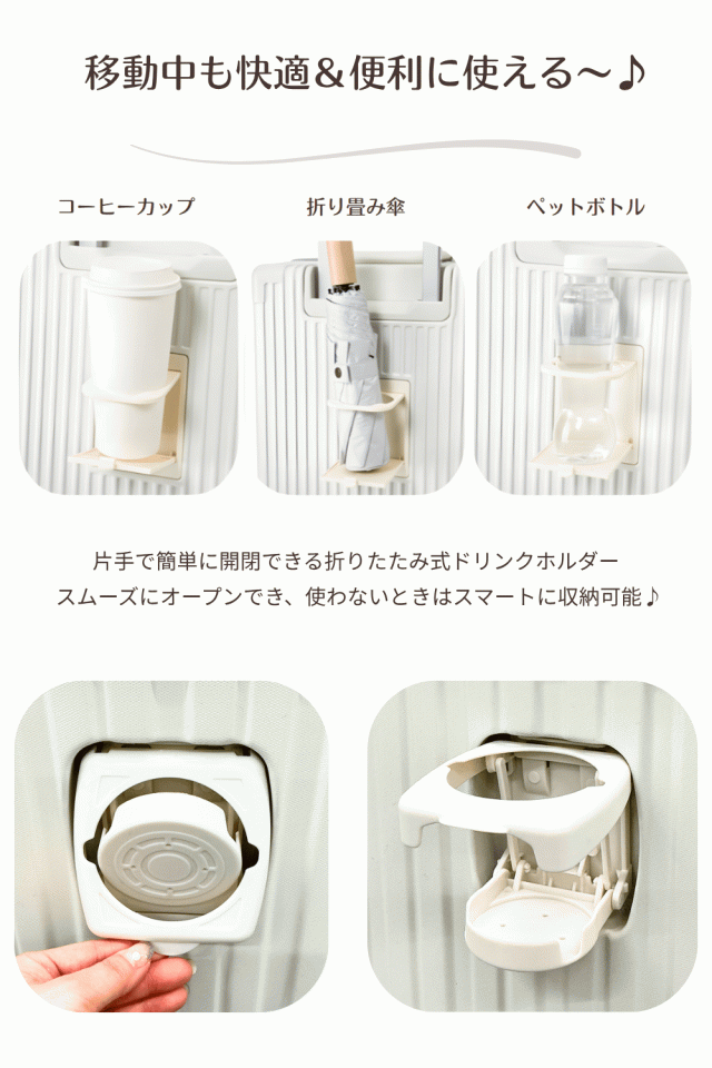 折りたたみ式のマルチホルダーを搭載。 ペットボトルやコーヒーカップ、折りたたみ傘を掛けられ、使わないときはスッキリ収納。 移動中も手がふさがらず、快適に持ち運べます。 |