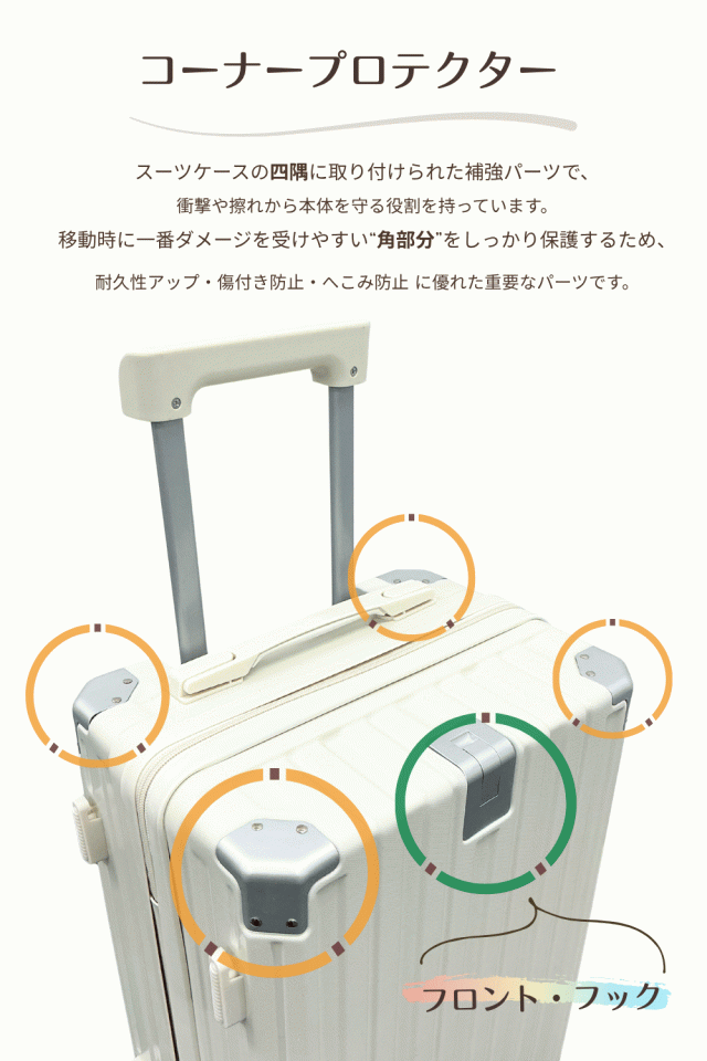 スーツケースの四隅に取り付けられた補強パーツで、 衝撃や擦れから本体を守る役割を持っています。 移動時に一番ダメージを受けやすい“角部分”をしっかり保護するため、 耐久性アップ・傷付き防止・へこみ防止 に優れた重要なパーツです。 |