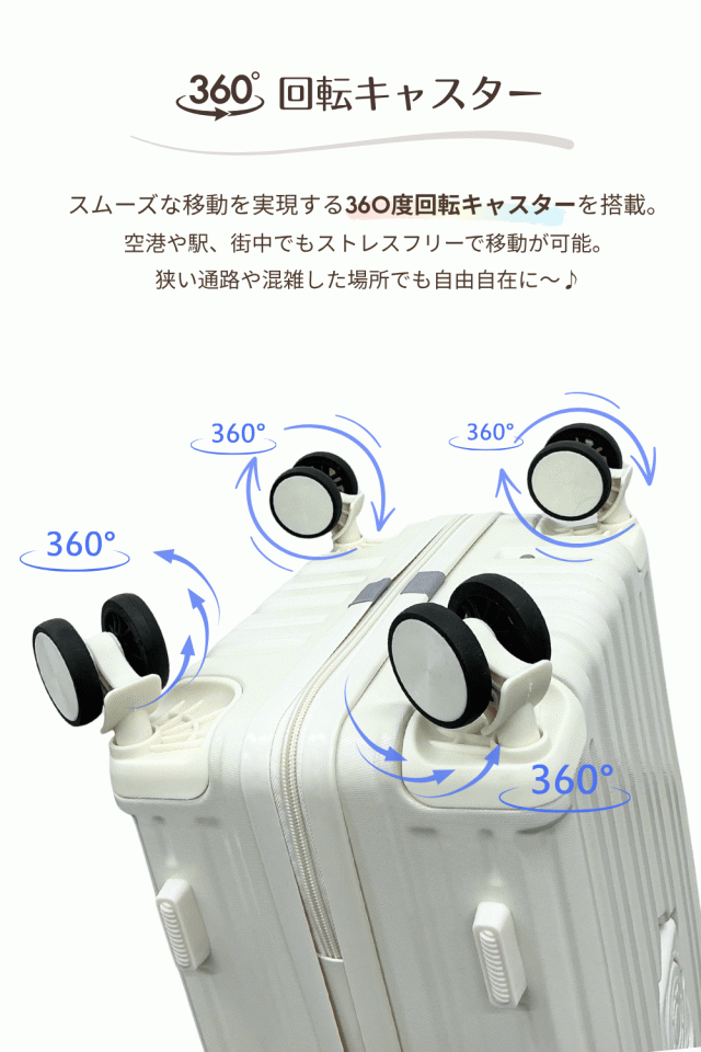静音仕様の360°回転キャスターを搭載。 どの方向にもスムーズに動かせるため、空港や駅の人混みでもストレスなく移動できます。 安定感があり、狭い通路でも軽やかに走行可能です。 |