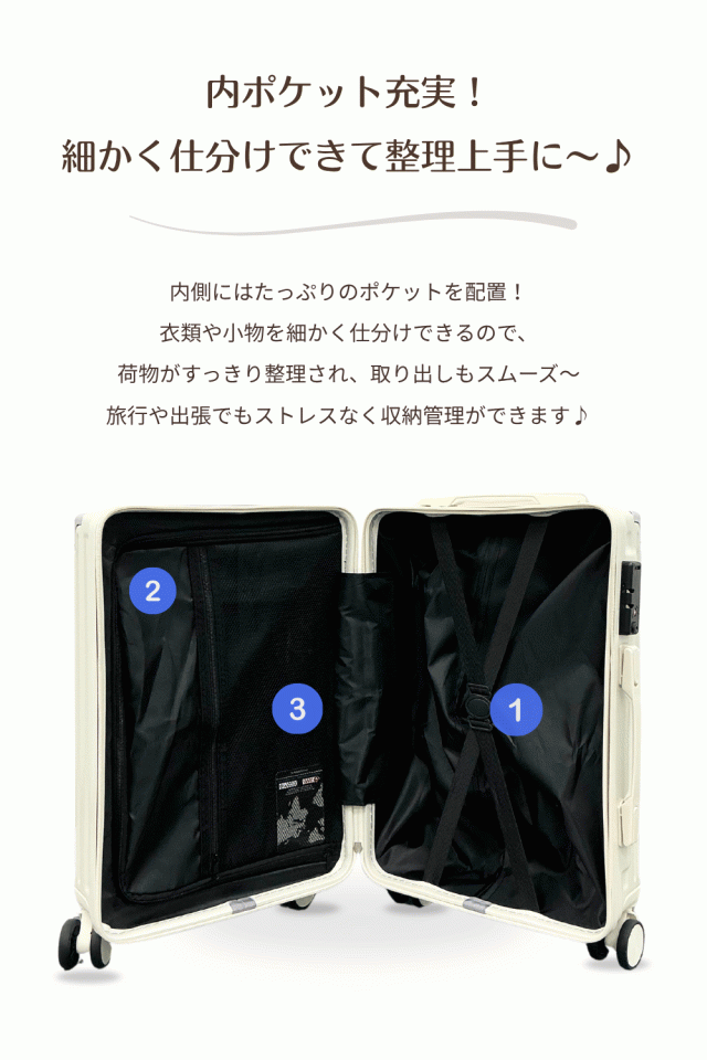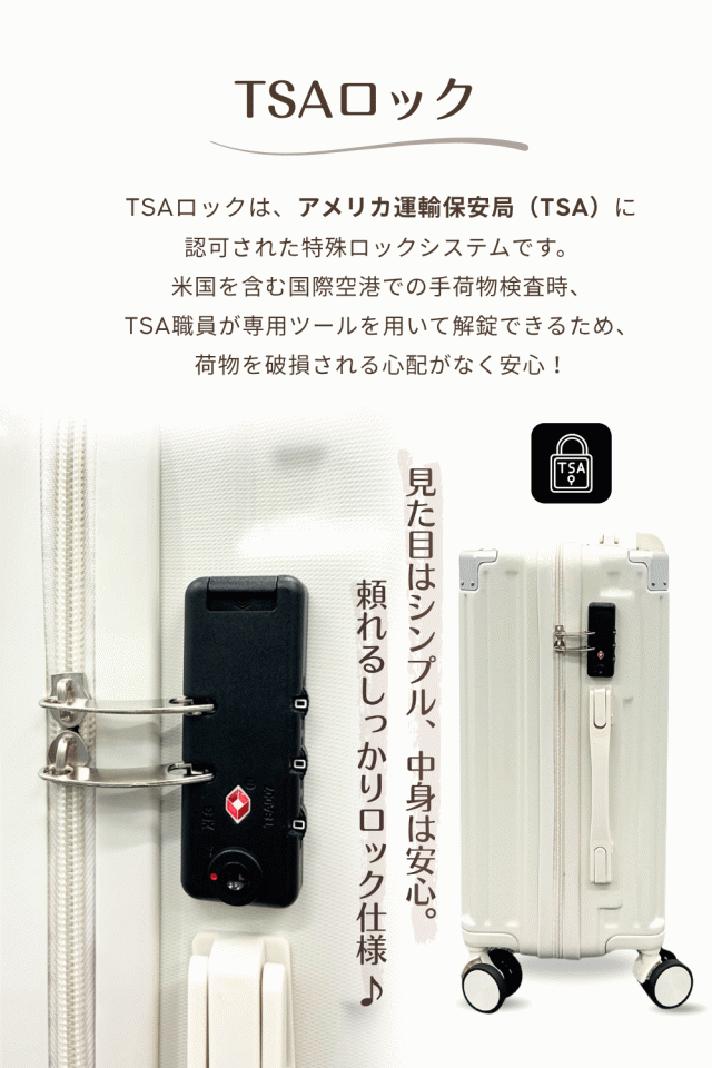 安心のTSAロックを搭載。 アメリカをはじめ海外空港での検査にも対応しており、 鍵を壊される心配なく荷物を預けられます。 旅行中のセキュリティも万全です。 |