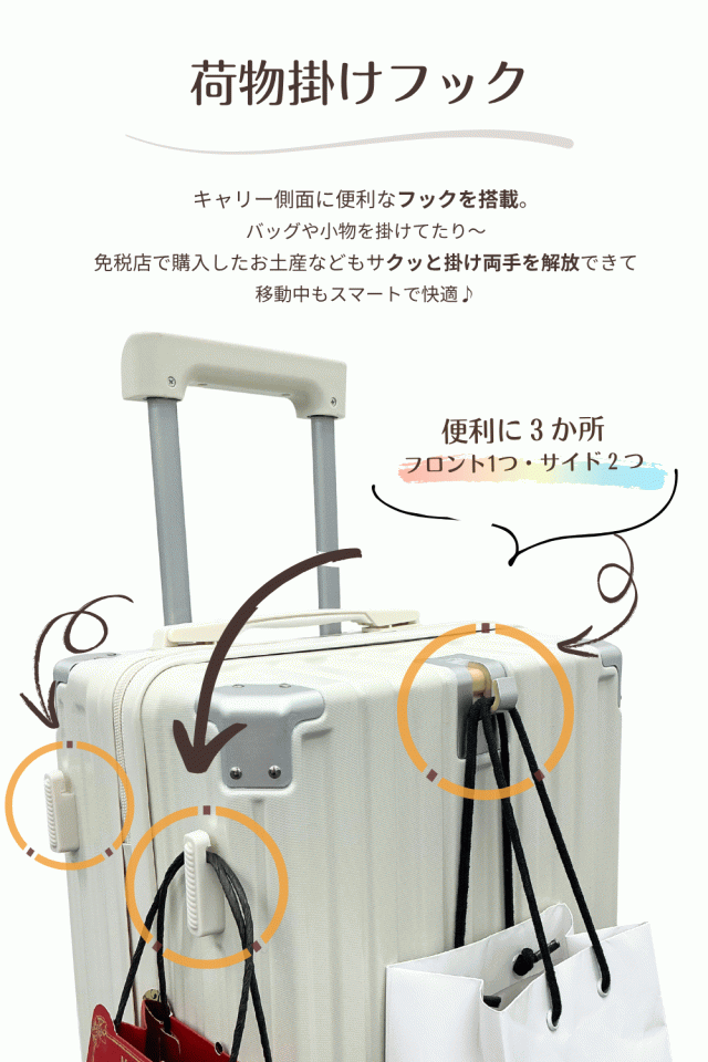 免税店で買ったお土産や小さなバッグもサッと掛けられる便利フック付き。 両手を自由にして、スマートに移動できます。 |