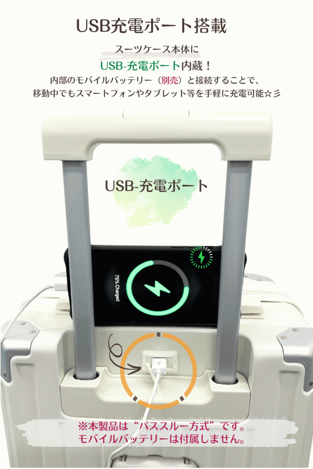 スーツケース本体にUSB-Aポート内蔵。 内部のモバイルバッテリー(別売)と接続することで、 移動中でもスマートフォンやタブレット等を手軽に充電できます。 ※本製品は“パススルー方式”です。モバイルバッテリーは付属しません。 |