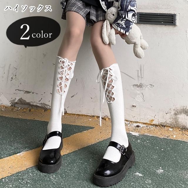 ハイソックス レディース 女性 くつした 靴下 膝下丈 ロング丈 レースアップ リボン 無地 ブラック ホワイト ゴシック ゴス