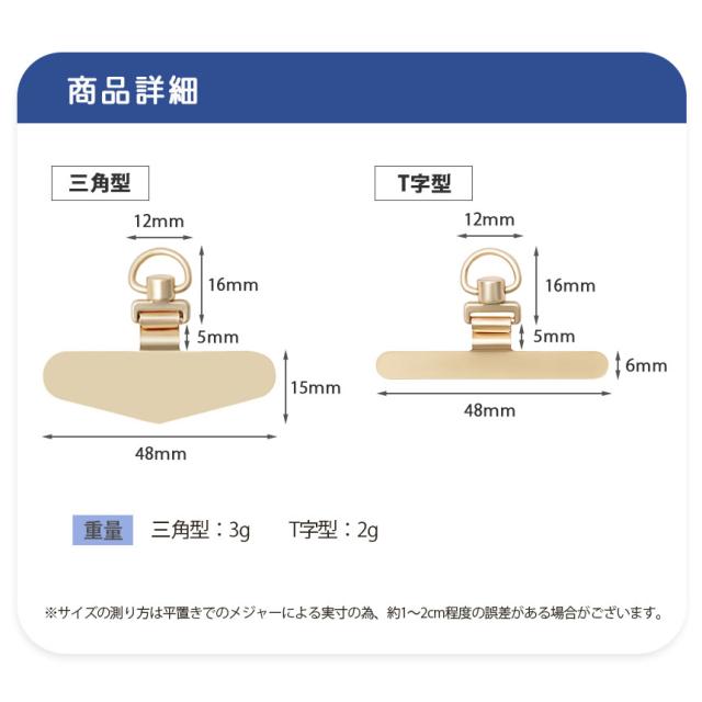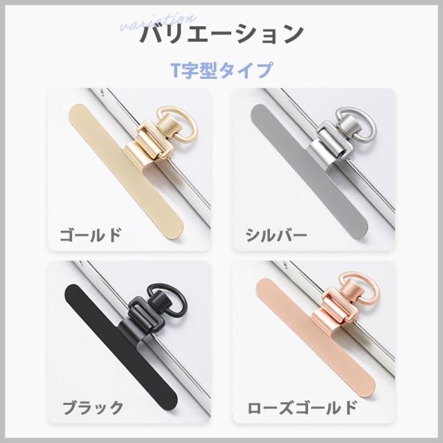 - T 字型ローズゴールドを購入しました。注文してすぐに届きました。可愛い色合いで、でもT字型だから悪目立ちもしない、そして丈夫と文句なしです。この色の金具のストラップがあったらいいのに、と思いました。