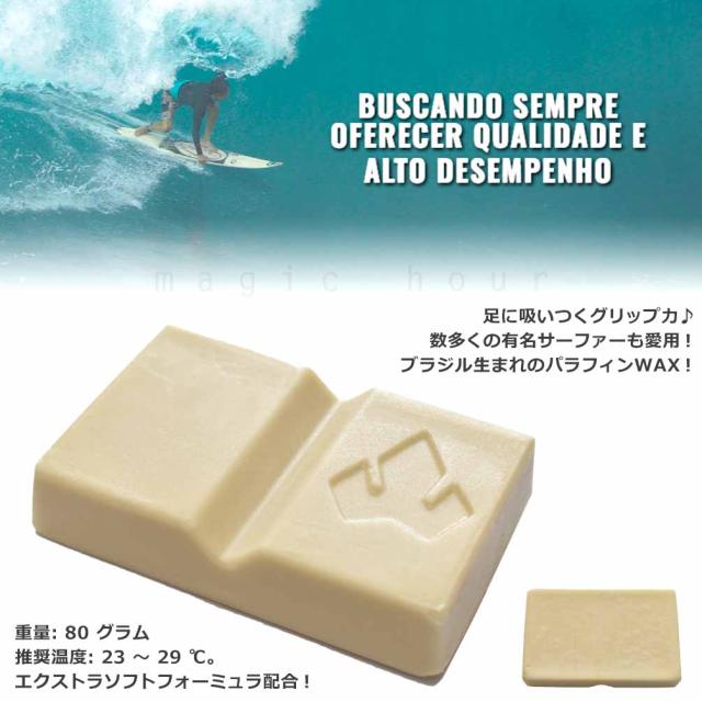 足に吸いつくグリップ力♪数多くの有名WTCサーファーも愛用のブラジル産ワックス♪ 耐久性が高く塗りやすい処方、グリップ力&粘着力も◎ 染料を使用していないナチュラルカラー。癖のない南国風のフルーティーな香りで気分もあがる♪ 推奨水温: 23℃〜29℃ (おおよそ6月末頃から10月中旬位)/ 重量: 約80グラム |