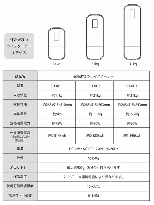 米びつ 保冷米びつ 白米 11Kg 電気代 コンパクト 静音 省エネ ライスクーラー 家庭用 米びつ 湿気 対策 防虫 スタイリッシュSLI-RC11 SLI-RC21 SLI-RC31