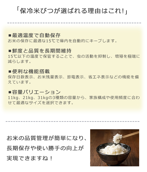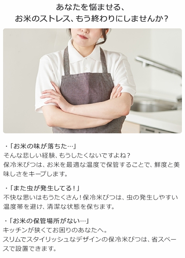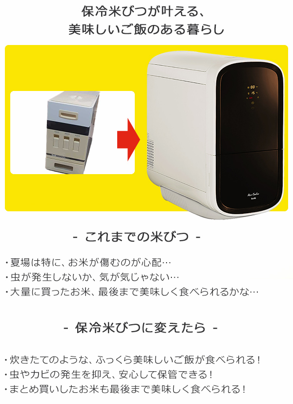 味わいを守る、暮らしを変える -毎日おいしいご飯のある暮らし- \保冷米びつのここがスゴイ/ ■最適温度で自動保存 お米の保存に最適な15℃で庫内を自動的にキープします。 ■鮮度と品質を長期間維持 15℃以下の温度で保管することで、虫の活動を抑制し、増殖を極端に減らします。 ■便利な機能搭載 保存日数表示、お米残量表示、節電表示、省エネ表示などの機能を備えています。 ■容量バリエーション 11kg、21kg、31kgの3種類の容量から、家族構成や使用頻度に合わせて最適なサイズを選択できます。 【お米の品質管理が簡単になり、長期保存や使い勝手の向上が実現できますね!】 1. 毎日炊きたてのような、あの感動を味わいませんか? 朝、炊飯器を開けると、ふわりと広がる新米のような香り。 ひとくち頬張れば、粒立ちの良いご飯が口いっぱいに広がり、思わず笑顔がこぼれる。 そんな、炊きたてご飯の感動を、毎日味わえたら、どんなに幸せでしょうか? 2. 保冷米びつが叶える、美味しいご飯のある暮らし ■これまでの米びつ ・夏場は特に、お米が傷むのが心配… ・虫が発生しないか、気が気じゃない… ・大量に買ったお米、最後まで美味しく食べられるかな… ■保冷米びつに変えたら ・いつでも炊きたてのような、ふっくら美味しいご飯が食べられる! ・虫やカビの発生を抑え、安心して保管できる! ・大容量タイプなら、まとめ買いしたお米も最後まで美味しく食べられる! 3. あなたを悩ませる、お米のストレス、もう終わりにしませんか? ・「お米の味が落ちた…」 そんな悲しい経験、もうしたくないですよね? 保冷米びつは、お米を最適な温度で保管することで、鮮度と美味しさをキープします。 ・「また虫が発生してる!」 不快な思いはもうたくさん! 保冷米びつは、虫の発生しやすい温度帯を避け、清潔な状態を保ちます。 ・「お米の保管場所がない…」 キッチンが狭くてお困りのあなたへ。 スリムでスタイリッシュなデザインの保冷米びつは、省スペースで設置できます。 4. 省エネで家計にも優しい 電気代が気になる方も安心。なぜなら... ・高効率の冷却システムで省エネ設計 ・1日の電気代はわずか数十円 ・節電モード搭載でさらに省エネ 保冷米びつは、省エネ設計だから、お財布にも優しいんです。 毎日使うものだからこそ、ランニングコストも大切ですよね。 5.もう「お米の買い置き」に悩まない ■大容量タイプなら、こんな悩みから解放されます。 ・頻繁な買い出しが不要に ・長期保存でも品質劣化の心配なし ・備蓄米の管理も簡単に 家族みんなが笑顔になる、美味しいご飯。 保冷米びつがあれば、そんな食卓を簡単に実現できます。 もう、お米の鮮度管理に悩む必要はありません。 毎日、炊きたてのようなご飯を味わう贅沢を、あなたも手に入れてみませんか? 【商品詳細】 ■RC11 本体サイズ:約268×515×510mm パッケージサイズ:323×561×611mm 本体重量:約11kg 米収納量:約9kg 【消費電力】 定格消費電力:約75W 1日消費電力(外気温25℃時)自社調べ:約0.814kwh ■RC21 本体サイズ:約268×515×703mm パッケージサイズ:304×550×741mm 本体重量:約11.5kg 米収納量:約21kg 【消費電力】 定格消費電力:約80W 1日消費電力(外気温25℃時)自社調べ:約0.825kwh ■RC31 本体サイズ:約268×515×843mm パッケージサイズ:323×561×945mm 本体重量:約15.2kg 米収納量:約31kg 【消費電力】 定格消費電力:約90W 1日消費電力(外気温25℃時)自社調べ:約1.246kwh 電源:DC12V/AC100-240V 50/60Hz 計量:約150g 米出しトレー:最大約900g(約6合)取り出せます。 保冷温度:12〜16℃ ※環境温度により異なります。 使用可能環境温度:15〜32℃ 電源コード長さ:約1.4m セット内容:ACアダプター・保証書付き取説 【保証期間】 1年 ■パッケージ:個別箱 【商品特徴・キーワード】 保冷米びつ 11Kg 21Kg 31Kg 電気代 コンパクト 静音 省エネ ライスクーラー 米びつ 湿気 対策 防虫 スタイリッシュ |