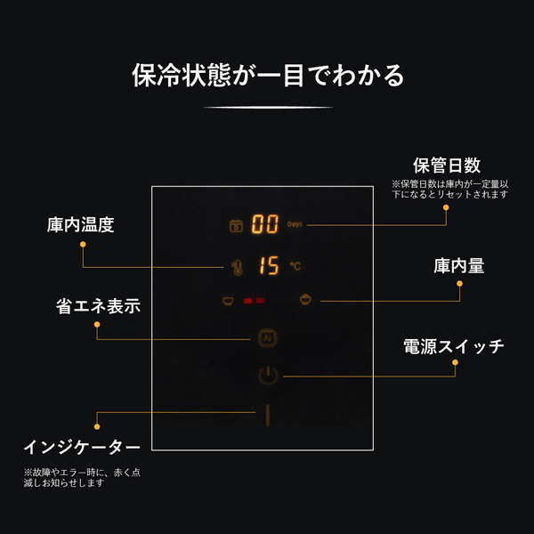 保存日数表示、お米残量表示、節電表示、省エネ表示などの機能を備えています。
