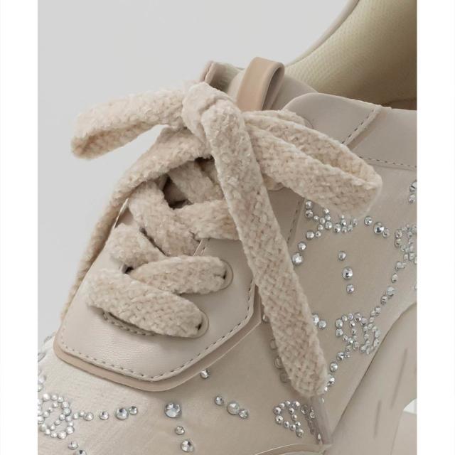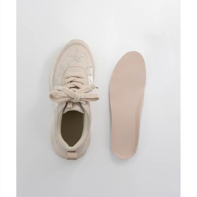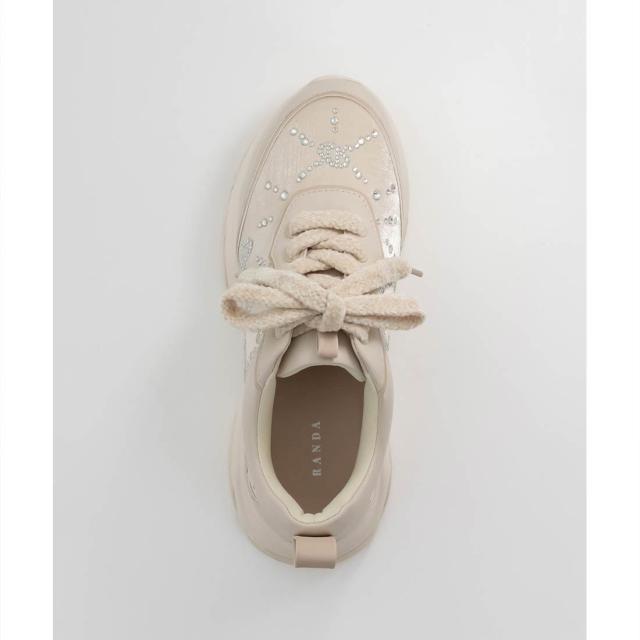 ボリュームソールを採用しカジュアルさを取り入れつつ、きらっと輝くホットフィックスストーンでフェミニンムードもプラスしたRANDAらしい1足です。