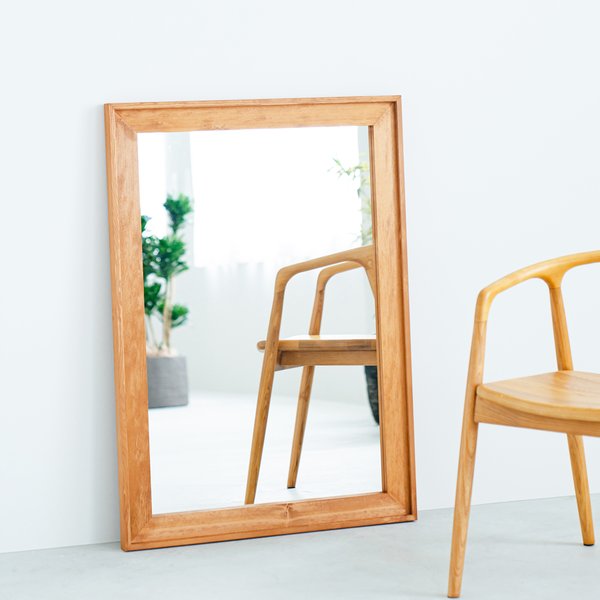 重厚感のあるL型の木枠が印象的なウォールミラー