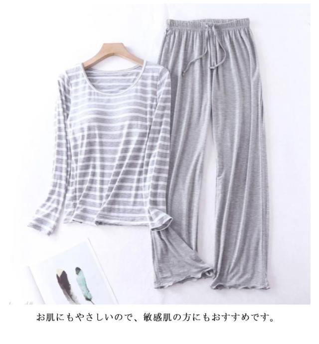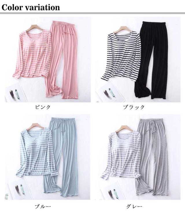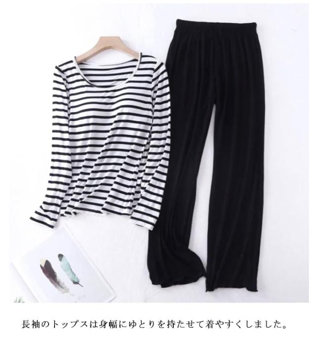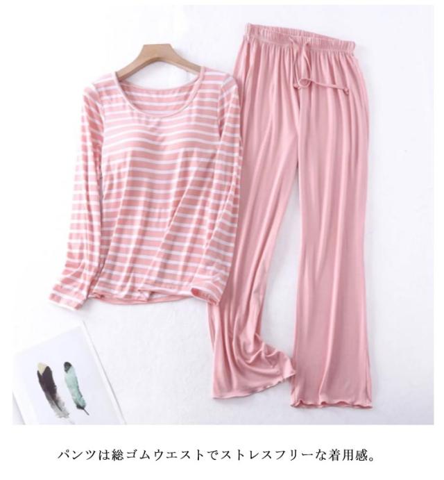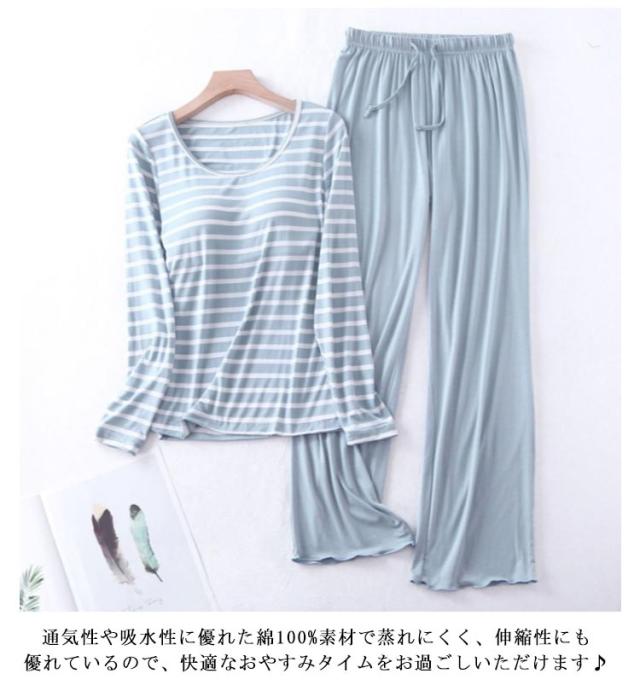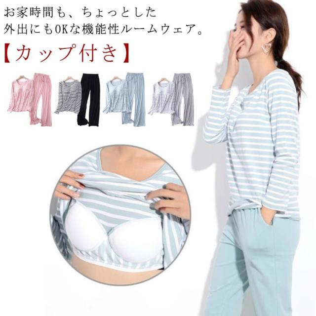 セットアップ レディース パッド tシャツ 上下セット パジャマ 秋冬 ロングパンツ ナチュラル 婦人 トップス 30代 長袖 長袖 長ズボン 部屋着 寝巻 無地 ボーダー柄 パジャマ おしゃれ 綿 ルームウェア カップ付き 40代 50代 60代 70代 母の日 敬老の日 プレゼント