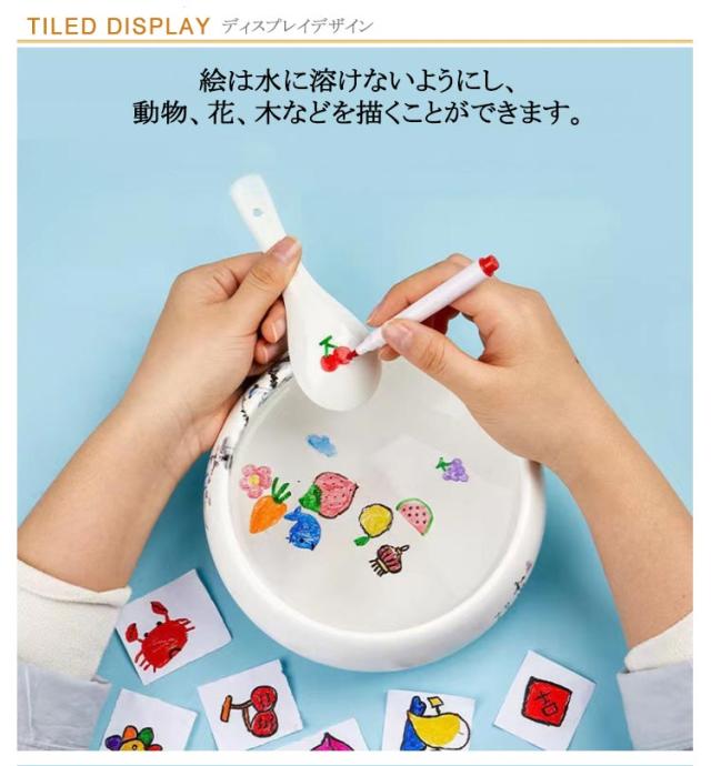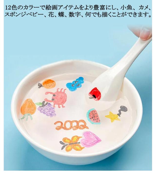 | 12色水彩画ペン+スプーン! 絵は水に溶けないようにし、動物、花、木などを描くことができます。 12色のカラーで絵画アイテムをより豊富にし、小魚、 カメ、スポンジベビー、花、蝶、数字、何でも描くことができます。 信頼できる安全性!非毒、無酸、環境と体にやさしいです。手や服にインクを付いた場合、水で簡単に洗えます。 | |