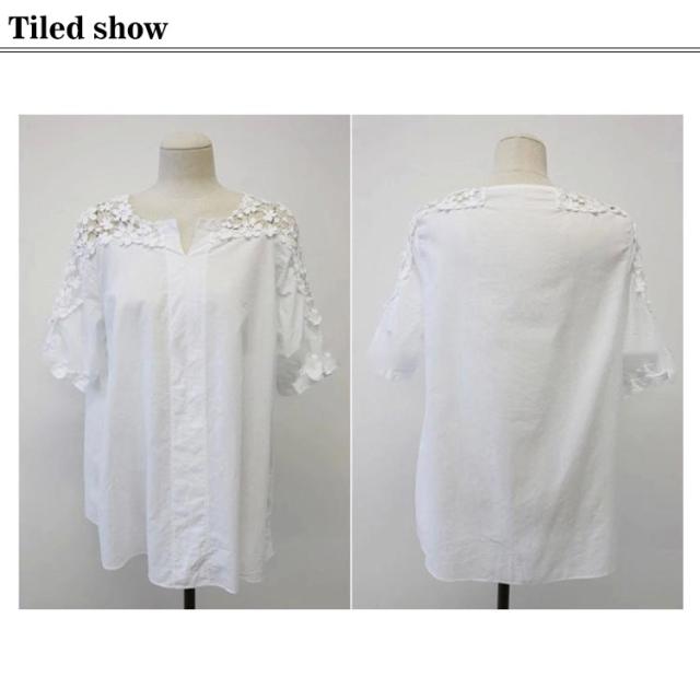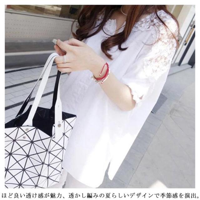 | きれいめのレース切替トップス たっぷりレースが涼しげで女性らしく可愛らしい印象に。 長すぎず短すぎず、程度良い5分袖で腕細みせ効果も期待できます。 ほど良い透け感が魅力、透かし編みの夏らしいデザインで季節感を演出。 シンプルなデザインなので、デニム等のパンツとにもスカートにも合わせやすいです。 | |