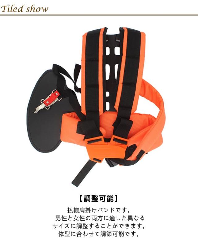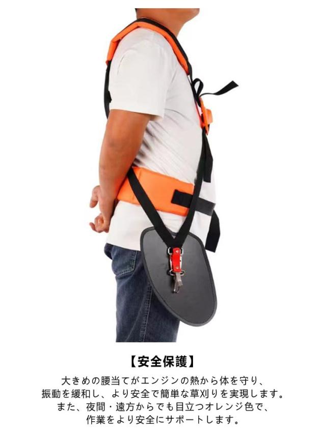 | 低反発素材/両肩・背・腰当てパット付き 草刈り作業をもっと楽に! H型草刈り機用両肩掛けベルト 【高品質】耐久性と長持ちのために高品質。草刈機、刈払機専用の両肩掛けベルトで長時間作業もらくらくです。 【負担軽減】クッション性のある厚めの肩パッドと腰当付きで機械の振動、接触痛を緩和、負荷を肩に均等に分配します。 【安全保護】大きめの腰当てがエンジンの熱から体を守り、振動を緩和し、より安全で簡単な草刈りを実現します。また、夜間・遠方からでも目立つオレンジ色で、作業をより安全にサポートします。 【調整可能】払機肩掛けバンドです。男性と女性の両方に適した異なるサイズに調整することができます。体型に合わせて調節可能です。 | |