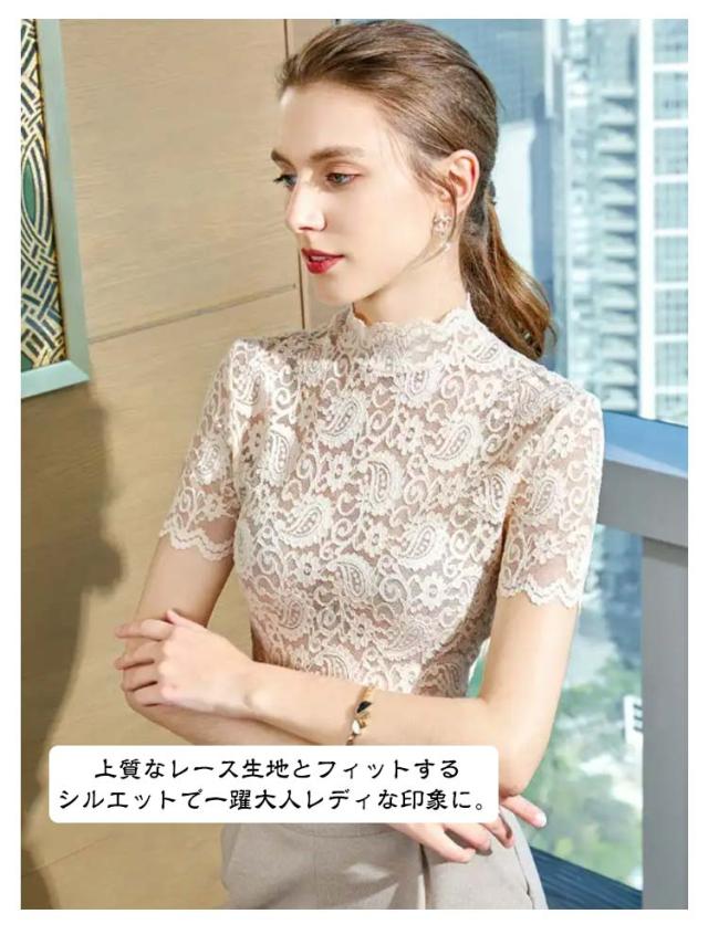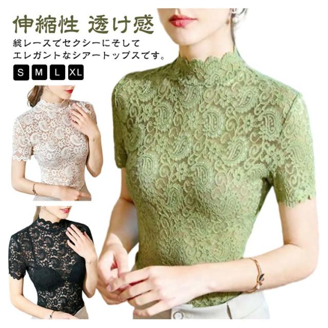 シアートップス ハイネック Tシャツ レディース 半袖 タートルネック シースルー 総レース 重ね着 花柄レース トップス 無地 伸縮性 カジュアル 薄手 透け感 インナー 可愛い エレガント お洒落 送料無料