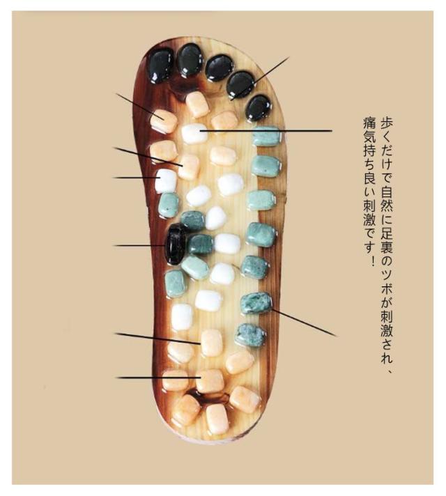 | 天然石の凹凸で足裏を刺激するサンダルです。 天然石の表面はコーティングされているので足裏を保護してくれます。 ベルト部分はマジックテープになっているので足のサイズに合わせて調整することができます。 アウトソールは滑り止め効果に優れたEVA素材を使用しています。 歩くだけで自然に足裏のツボが刺激され、痛気持ち良い刺激です! | |