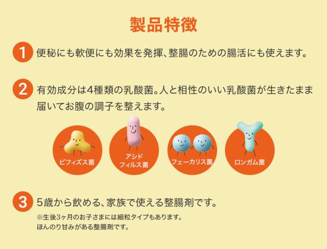 | 効能 | 整腸(便通を整える)、軟便、便秘、腹部膨満感 |