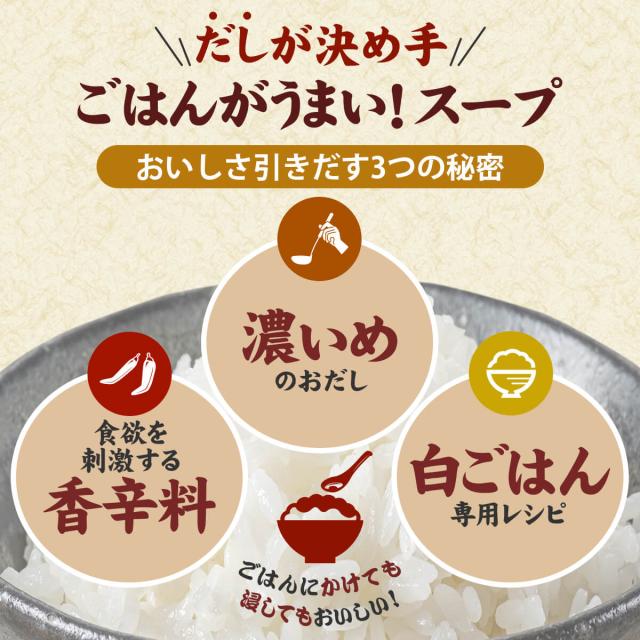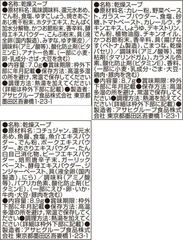 | 内容量 | ■ Theうまみ ごはんがうまい! 特製たまごスープ 7.0g スパイスカレースープ 8.7g 旨辛チゲスープ 8.9g 3種 各8食 24食 |