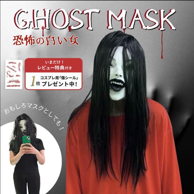 【レビューで傷シールGET】 マスク 恐怖の白い女 白肌の女幽霊 被り物 かぶりもの ウィッグ一体型 帽子 サプライズ リアル ホラー おもしろ グッズ コスプレ アイテム 老若男女 万人受け フリーサイズ ハロウィン クリスマス 文化祭 学園祭 忘年会 仮装