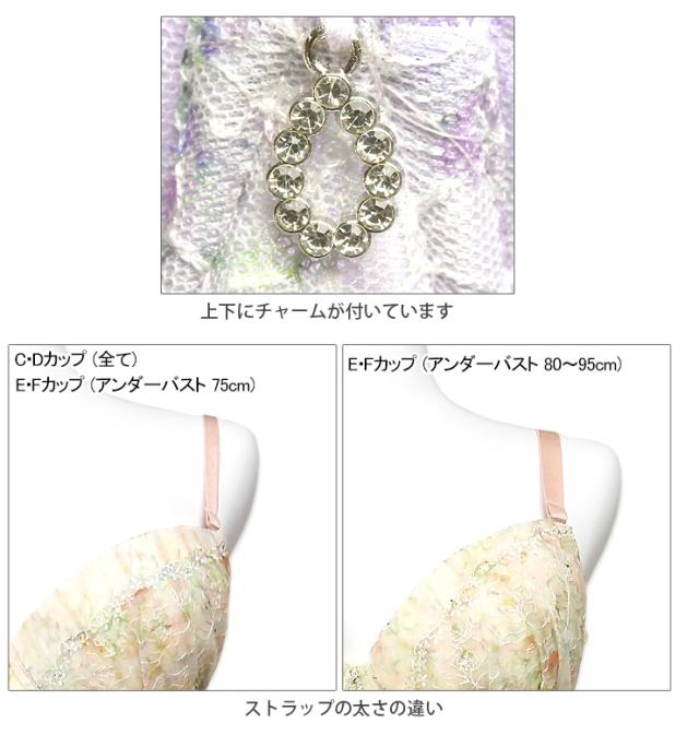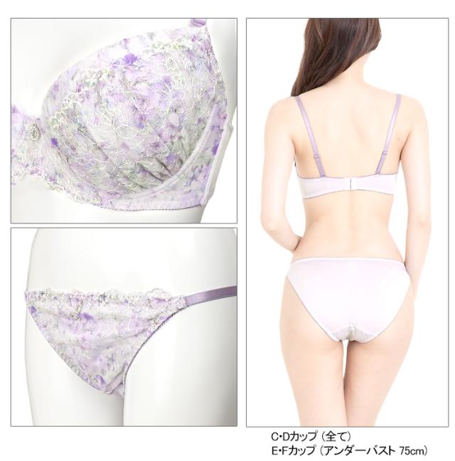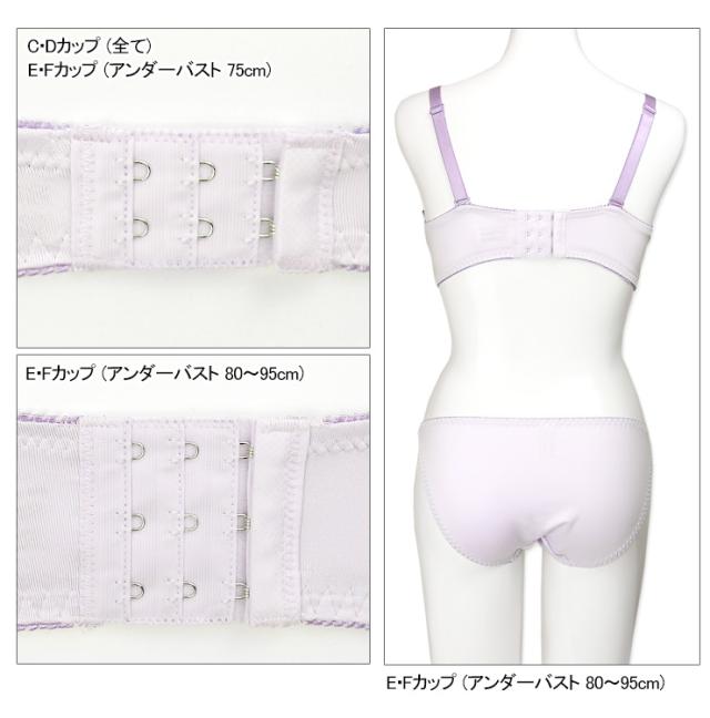・ホック:2段3列(C・Dカップ全て/E・Fカップアンダーバスト75cm)3段3列(E・Fカップアンダーバスト80〜95cm)・3/4カップ・ワイヤー入り・肩ストラップ調節可・肩ストラップ取外可・パット内蔵・パットポケットなし
