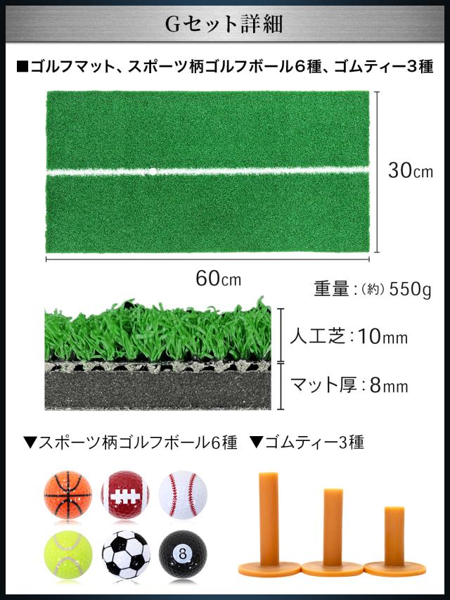 ゴルフマット、スポーツ柄プリントゴルフボール6種、ゴムティー3個