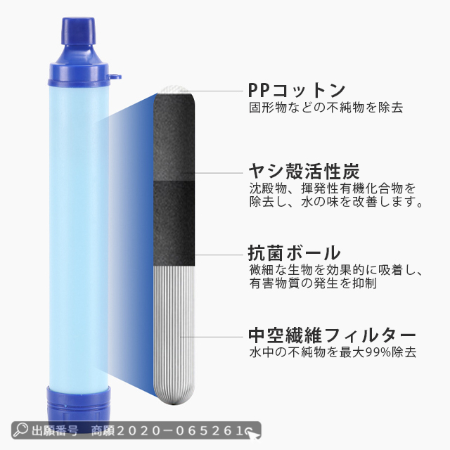 | 製品特徴 | ◆人体に悪影響を与える異物、汚れなどを除去する携帯型浄水器です。 ◆先端部を水の中に入れてストローを使うように水を吸い込むだけ。 ◆電源や交換部品が必要なく1500リットルまで利用可能です。 ◆ゴミ、砂、泥、塩素なども取り除くことができます。 ◆登山、キャンプ、海外旅行などでも役立ちます。 ◆災害時など綺麗な水が入手できない際にご利用頂けます。 ◆完全に除去できるわけではありません。 |