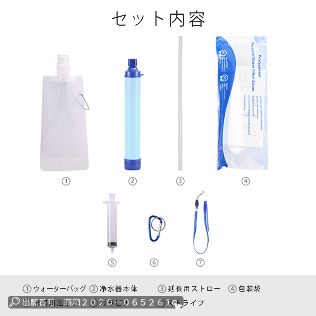 | セット内容 | ◆ウォーターバッグ*1、浄水器本体*1、延長用ストロー*1、包装袋*1、清掃用注射器*1、カラビナ*1、ストライプ*1 |