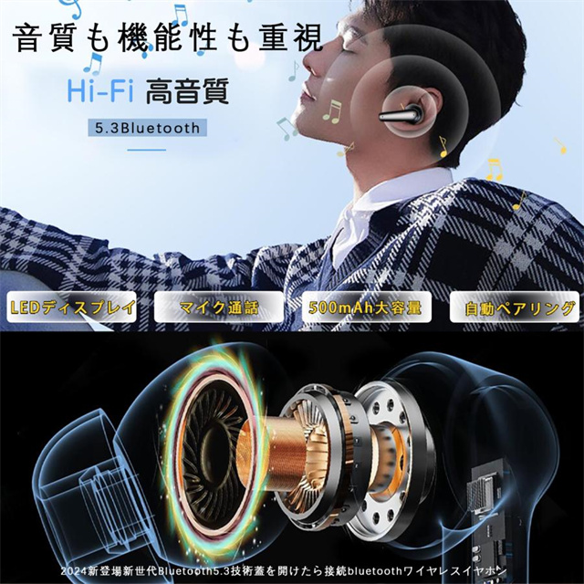 高音質 ワイヤレスイヤホン 自動ペアリング SIRI対応 超軽量 HIFI高音質 片耳 両耳 生活防水 BLUETOOTH5.3 安定性抜群 左右分離型片耳でも両耳でも使用 HIFI高音質 クリアな通話 シンプルなタッチ 操作簡単 iPhone/Android/ipod 超コンパクト 持ち運び便利 マイク内蔵付き 防水防汗 知能タッチ 超長待機 フィットする 自動ベア