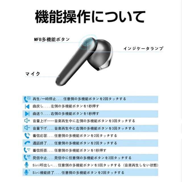 | 機能 | ◆通話/曲再生/一時停止/スキップ/曲戻し/ボリュームコントロール(UP/DOWN)/Siri |