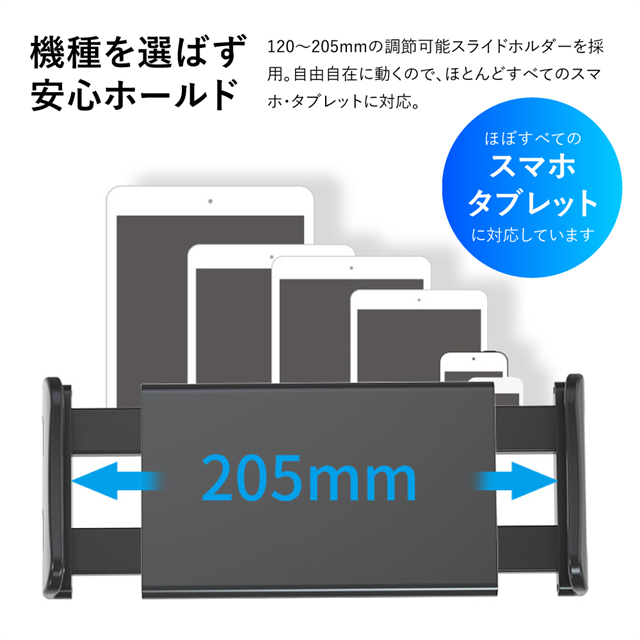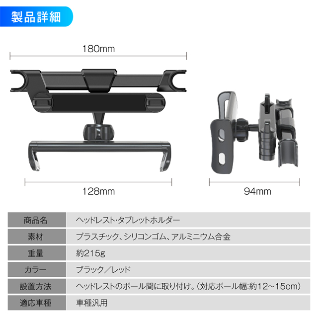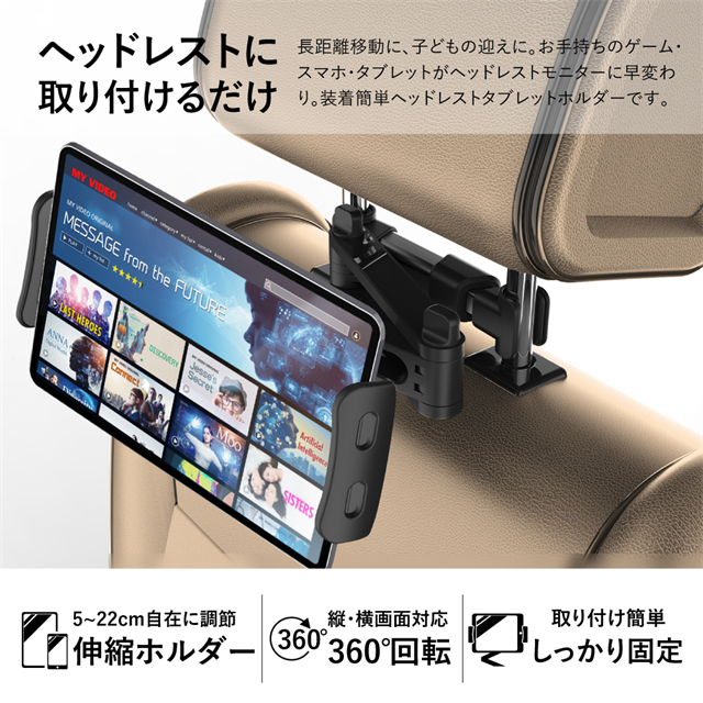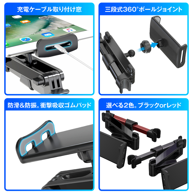 | 商品紹介 | ◆▼POINT.1 「いつものシートが快適映像空間になります!」 ・長距離移動に、子どもの迎えに。 ・お手持ちのゲーム・スマホ・タブレットがヘッドレストモニターに早変わり。 ・装着簡単ヘッドレストタブレットホルダーです。 ▼POINT.2 「好きな位置で好きな角度に調整!」 ・5〜22cmの伸縮アームと360°回転のフレキシブルヘッドを採用。 ・見やすい位置に、使いやすい角度に、自由自在に調整可能。 ▼POINT.3 「機種を選ばず安心ホールド !」 ・120〜205mmの調節可能スライドホルダーを採用 ・自由自在に動くので、ほぼすべてのスマホ・タブレットに対応。 *耐荷重:約500g ▼POINT.4 「取り付け簡単・しっかり固定!」 ・ベース部分には強力スプリングを内臓。 ・安定バツグン、固定は簡単ワンタッチ。 ▼POINT.5 「細部にこだわり高機能&高品質!」 ・三段式360°ボールジョイント ・充電ケーブル取り付け窓 ・防滑&防振。衝撃吸収ゴムパッド ・選べる2色。ブラックorレッド 「 軽量 」「 耐久性 」「 使いやすさ 」を実現した こだわりのタブレットホルダーで、お客様の車内を快適にします! |