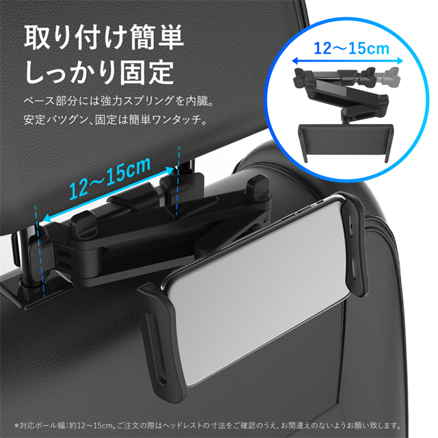 | 【設置方法】 | ◆ヘッドレストのポール間に取り付け。(対応ポール幅:約12〜15cm) |