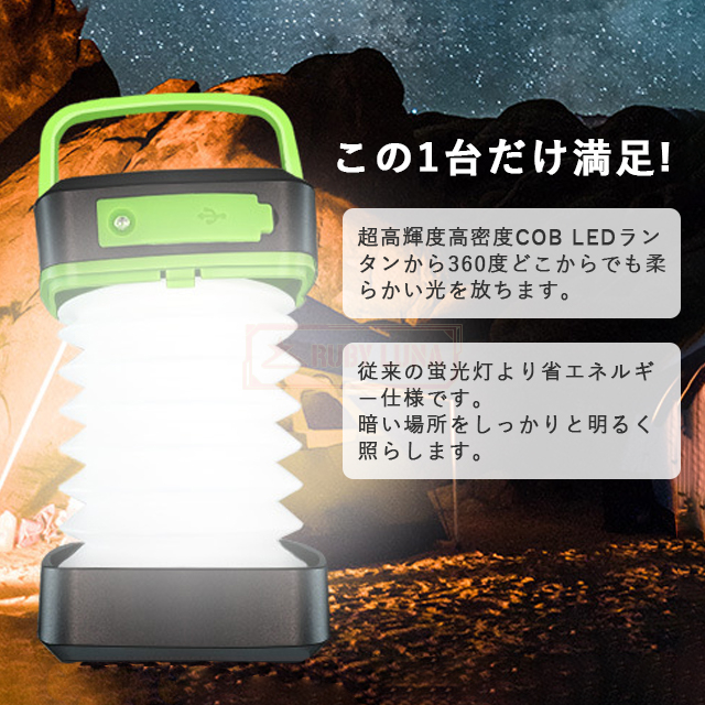 | 【超高輝度&バッテリー機能付き】 | ◆高密度COB LEDランタンから360度どこからでも柔らかい光を放ちます。従来の蛍光灯より省エネルギー仕様です。 暗い場所をしっかりと明るく照らします。明るさは最大1000ルーメン、ビーム角も360°で、停電時に部屋全体を明るく照らし、キャンプの時にもメインランタンとして使えます。そして、本LED ランタンは最大の特徴がモバイルバッテリーとしても使えること。いざという時に役立つ機能が詰まっているランタンです。 |