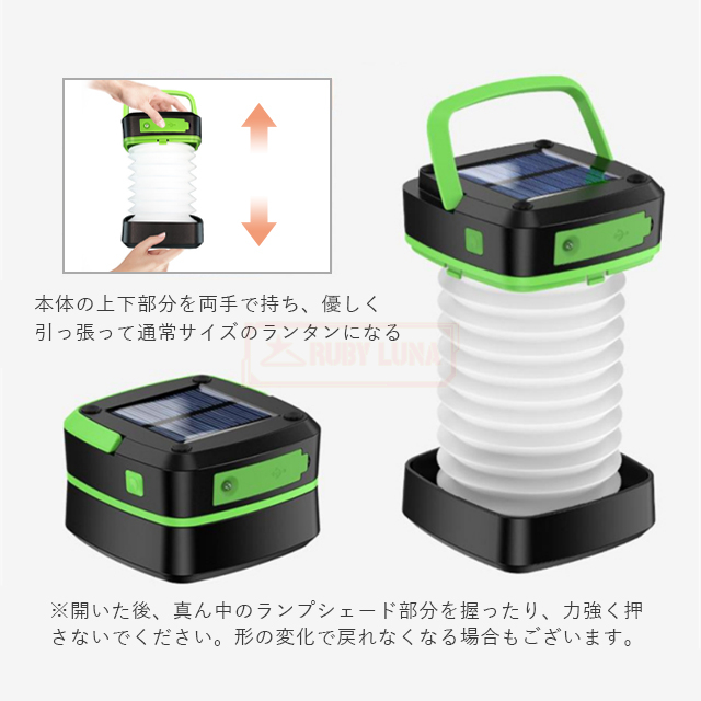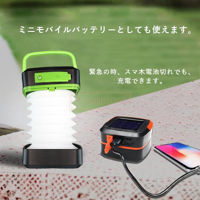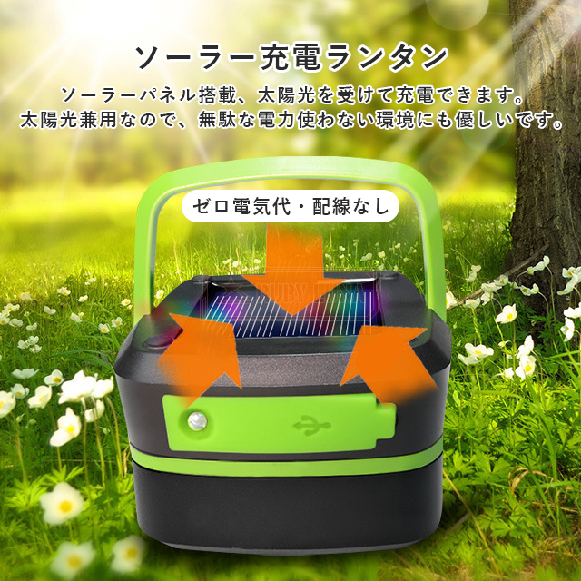 | 【USB充電式&ソーラーランタン】 | ◆USB充電式とソーラー充電の2種類給電方式があります。LEDランタン本体にはUSB充電口を設けるので、パソコン、モバイルバッテリーから充電可能です。また、ソーラーパネルを搭載し、日当たりに置いて自動充電できます。ソーラーランタンなら、外出先でも太陽の光さえあればどこでもいつでも充電可能です。いざという時にも安心です。 |