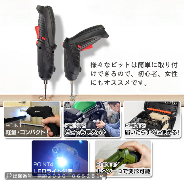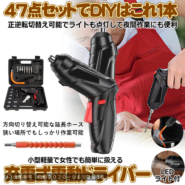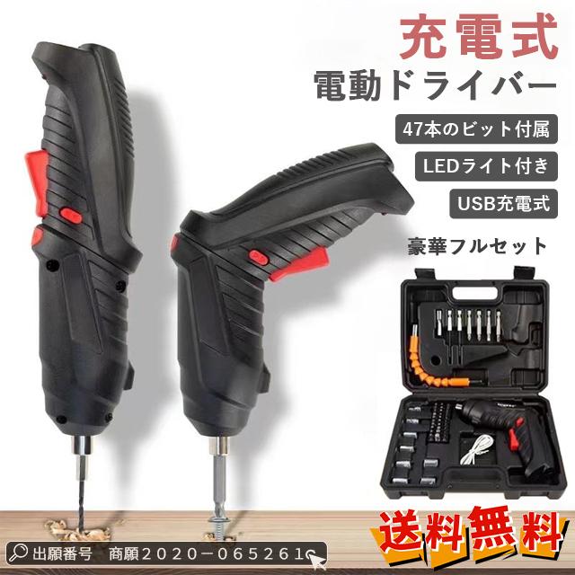 最安挑戦 冬新作 送料無料 新作 電動ドライバー 充電式 コードレス LEDライト付き 小型 電動ドリル 47点セット USB充電式 コンパクト 2Way 正逆転切り替え LED照明 軽量 大工 工具 工具セット