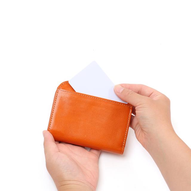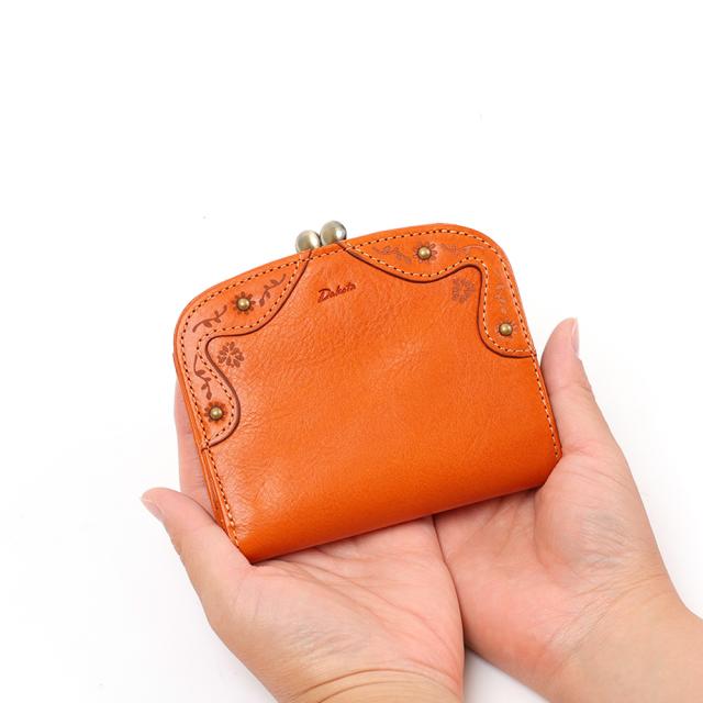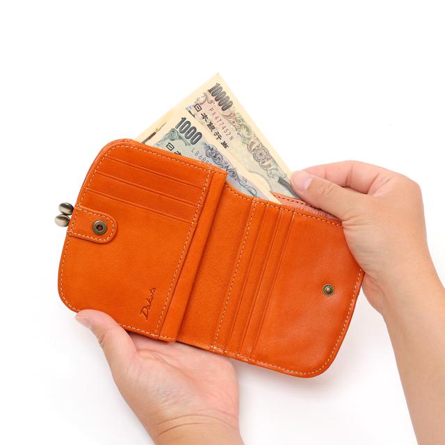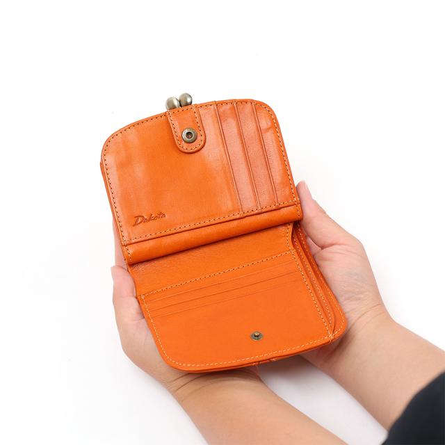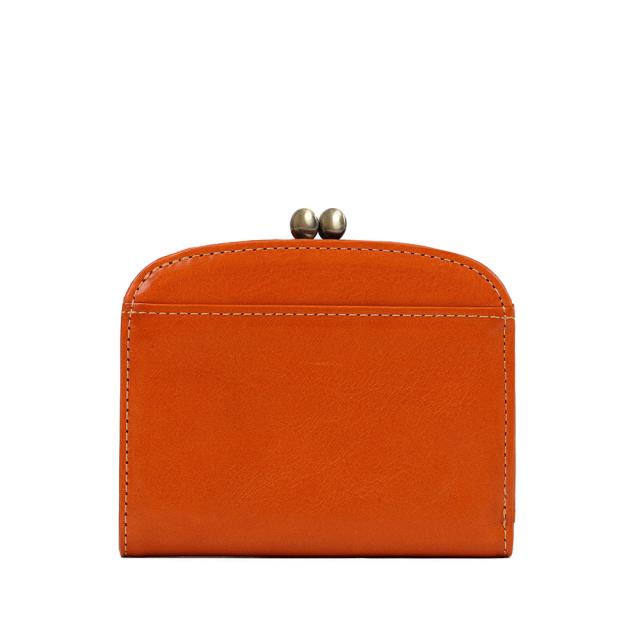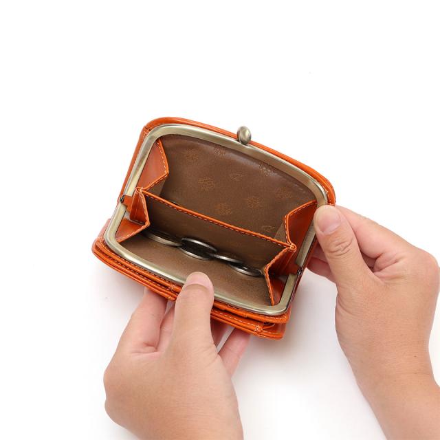 アンティーク感のあるがま口金具と平たく特徴的なつまみ金具が印象的な二つ折り財布です。がま口開閉の小銭入れは、パチンとワンアクションで開閉が出来るので、お会計もスマートにこなせます。