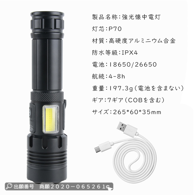 | 製品仕様 | ◆素材:高硬度アルミニウム合金 ◆灯芯:P70 ◆防水等級:IPX4 ◆電池:18650/26650 ◆航続:4-8h ◆重量:197.3g(電池を含まない) ◆ギア:7ギア(COBを含む) ◆サイズ:265*60*35mm |