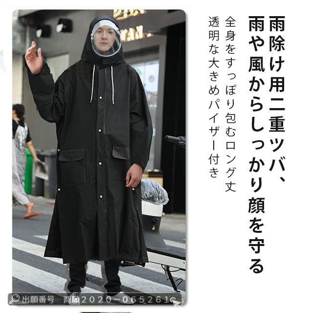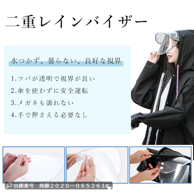 | 大きな二重つば付き | ◆フードに透明で取り外し可能なレインバイザーが装着されており、視界をクリアにしながら防滴、防風、防雪の効果を発揮します。 ◆顔をしっかり遮蔽するため、斜めからの雨でも顔が濡れず、風の強い日でもフードが飛ばされることがありません。 ◆フードは、雨水が入り込まないように調整することができます。 ◆これがあれば、傘を差さずに、視界を遮ることなく安全に運転できるので、自転車やバイク、原付バイクを運転するときにとても便利です。 |