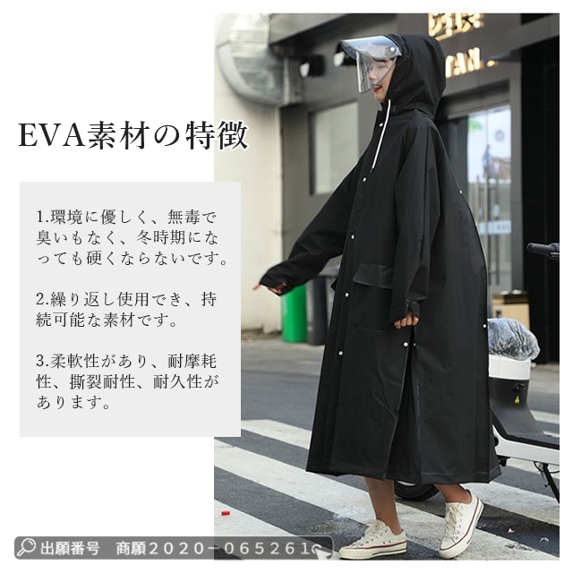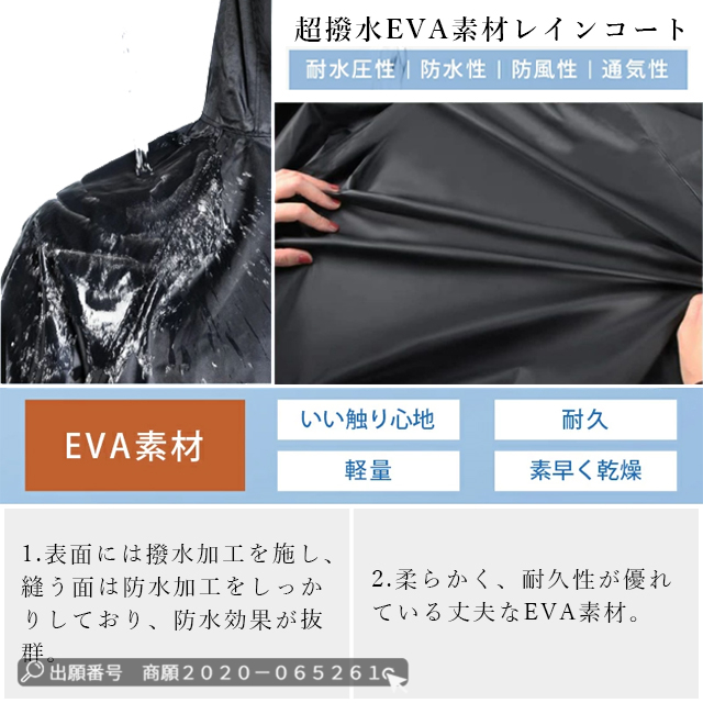 | 多層防水と環境に優しいEVA素材 | ◆このレインコートは環境に優しいEVA素材を採用し、防水性が高く、丈夫で破れにくく、耐久性に優れています。 ◆撥水加工で、雨水が染み込まず、よく撥水されます。 ◆前面はファスナーとボタンの二重構造になっており、ファスナーを閉めてからボタンを閉めれば、水や風の侵入を防ぐことができます。 ◆コンパクトに折りたたんで、自宅やオフィス、車内に置いておけば、急な雨にも対応できます。 |