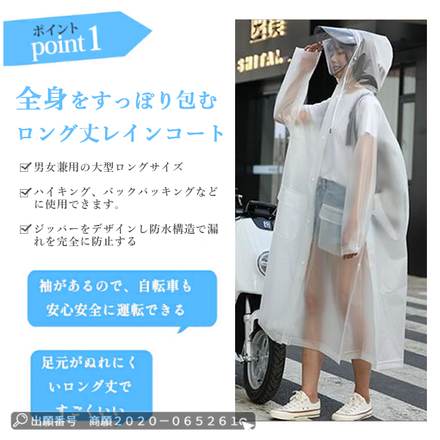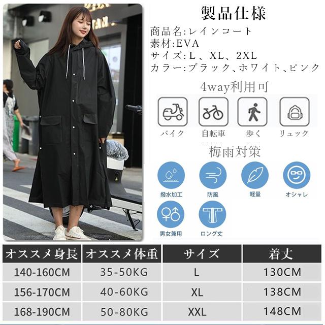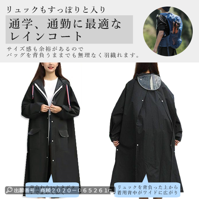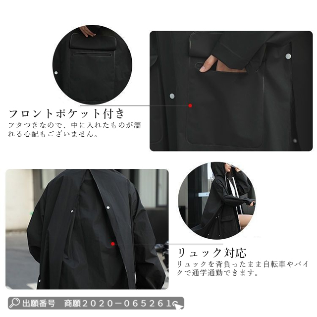 | 多層防水と環境に優しいEVA素材 | ◆レインウェアの身頃やファスナーを閉めると、普通に歩ける。 ◆通勤、通学、登山、自転車、オートバイなどに適用できます。 ◆レインウェアの背中に2つのボタンが隠されています。 ◆強風や大雨のときでも、体に合わせて裾幅を自由に調整できます。 ◆背中に余裕があるので、バックパックを背負っていても着用できます。 ◆さらに、着脱も簡単です。 ◆袖口には調節ボタンがあり、雨の侵入を防ぎます。 ◆サイドには大きなポケットが2つあり、携帯電話や鍵などを入れるのにとても便利です。 ◆ 袖口には調節ボタンがあり、雨の侵入を防ぎます。 |