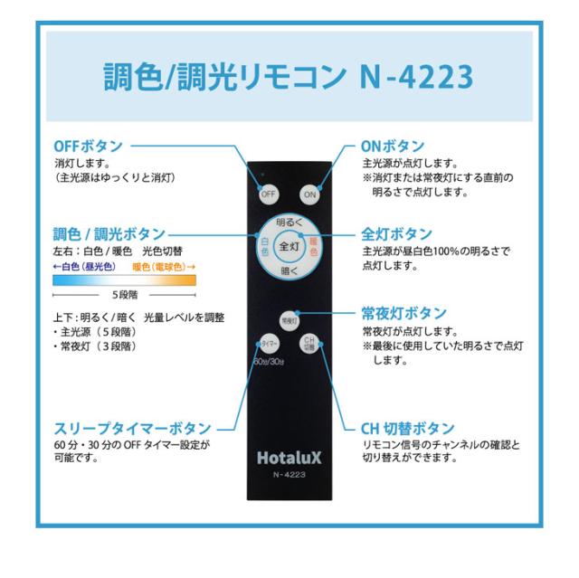 多段調光:(100%⇔約70%⇔約50%⇔約30%⇔約10%)、LED常夜灯(3段階調光)、滅調色段階 5通り