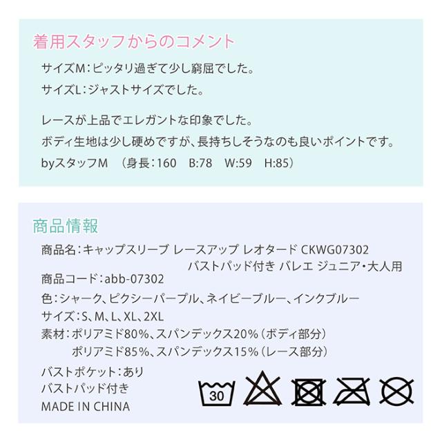 商品名:キャップスリーブ レースアップ レオタード CKWG07302 バストパッド付き バレエ ジュニア・大人用 商品コード:abb-07302 色:シャーク、ピクシーパープル、ネイビーブルー、インクブルー サイズ:S、M、L、XL、2XL 素材:ポリアミド80%、スパンデックス20%(ボディ部分) ポリアミド85%、スパンデックス15%(レース部分) バストポケット:あり バストパッド付き MADE IN CHINA