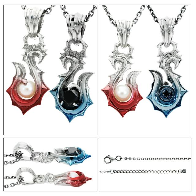 プレシード加工でグラデーションをかけた、赤と青のフィッシュフックを合わせるとハート型になるペンダント。
