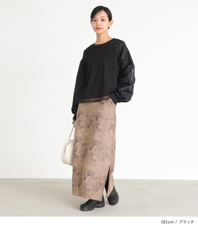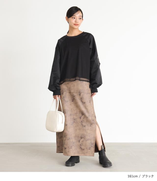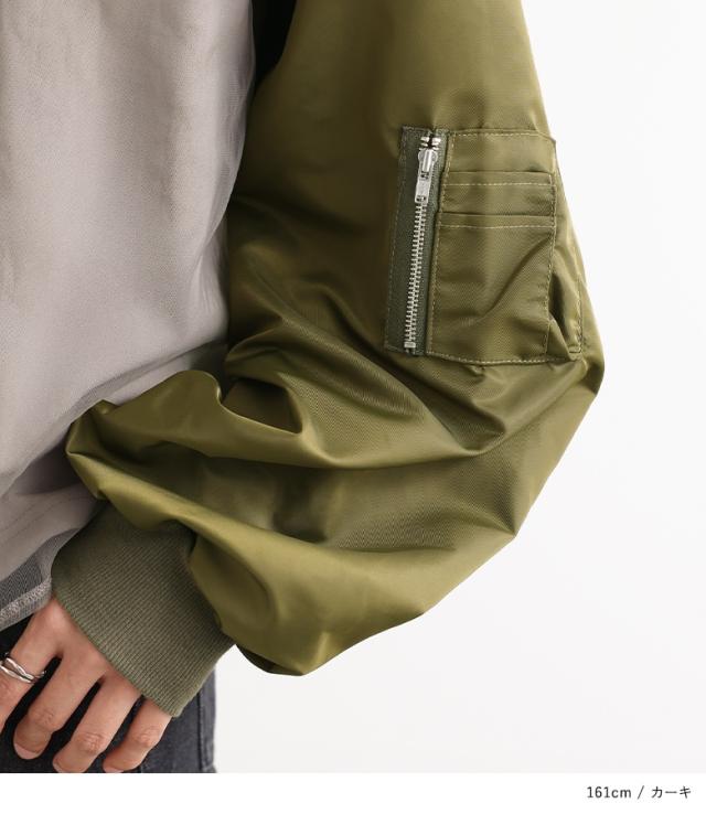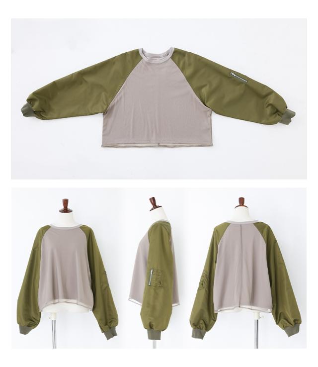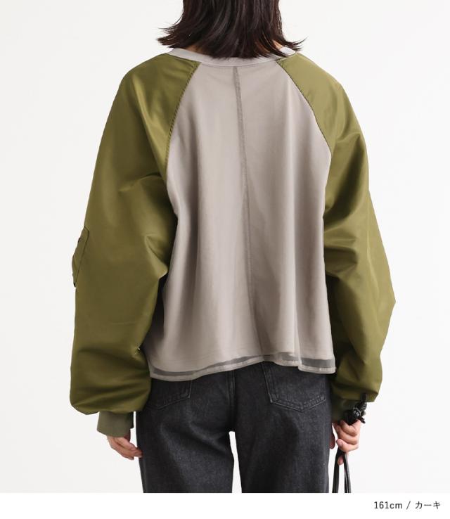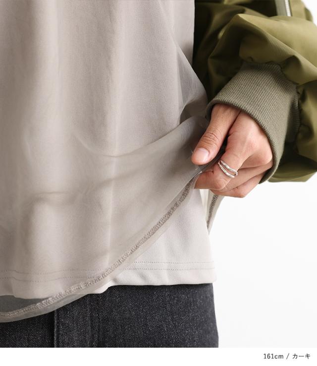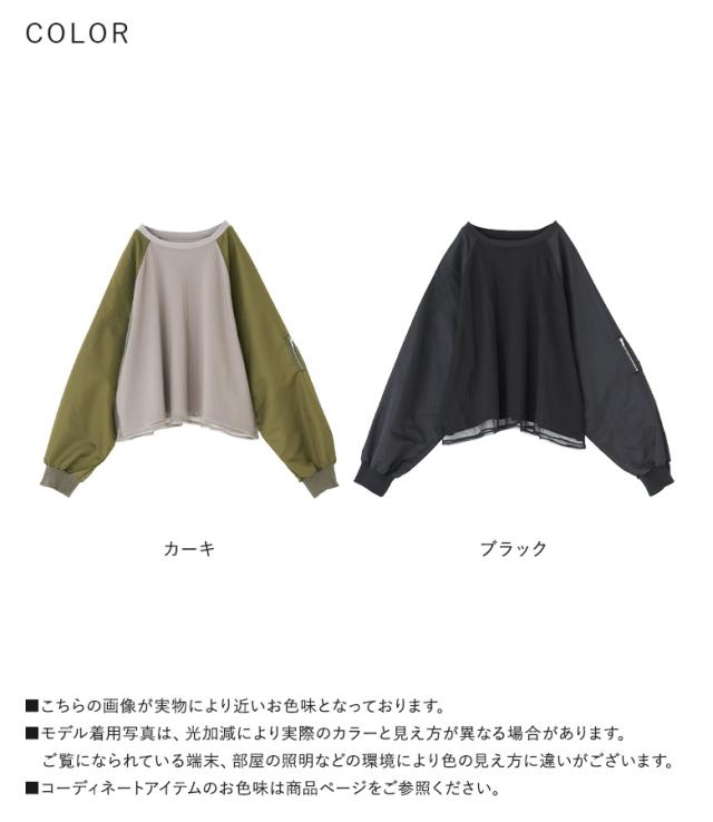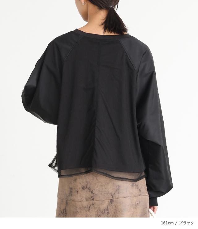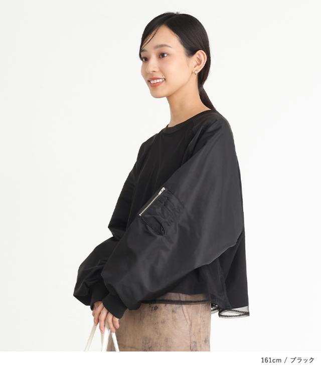 『MA-1スリーブトップス』※メール便可※【10】[プルオーバー レディース トップス カットソー チュール 長袖 長袖トップス ロンT ボリューム袖 異素材 切替 ドッキング Tシャツ オシャレウォーカー]