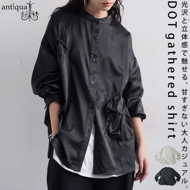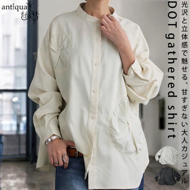 【検索ワード】ドットギャザーデザインシャツ シャツ レディース トップス 長袖 無地 ブラウス ゆったり スタンドカラ— バンドカラ— ドットギャザー ニュアンス 前開き ボタン ラウンド裾 光沢感 甘さ控えめ ドロップショルダー オーバーサイズ ヨーク 高級感 落ち感 モード 大きめ 大きいサイズ ブラック 黒 アイボリー 白 antiqua アンティカ 大人 おしゃれ 10代 20代 30代 40代 50代 60代 春 秋 冬 お洒落 カジュアル かわいい かっこいい あんてぃか