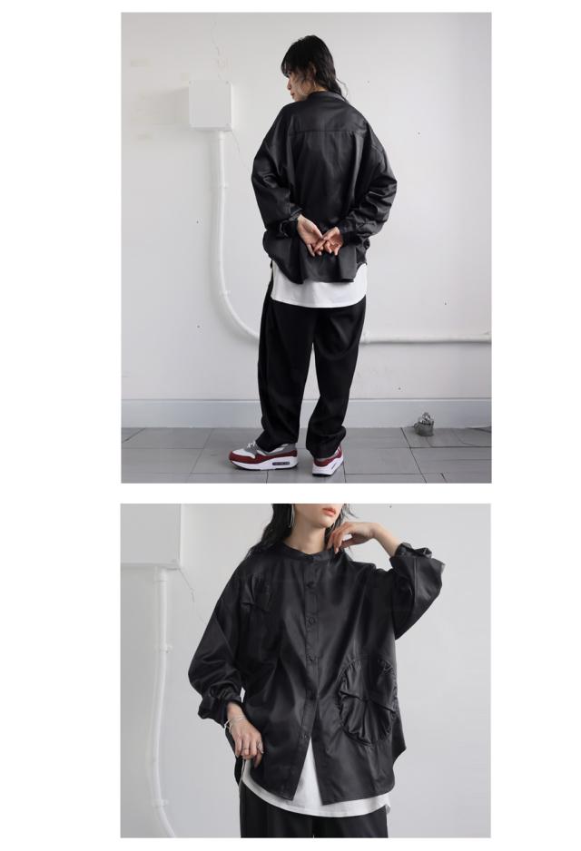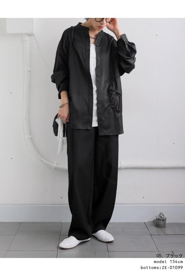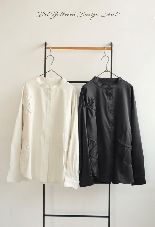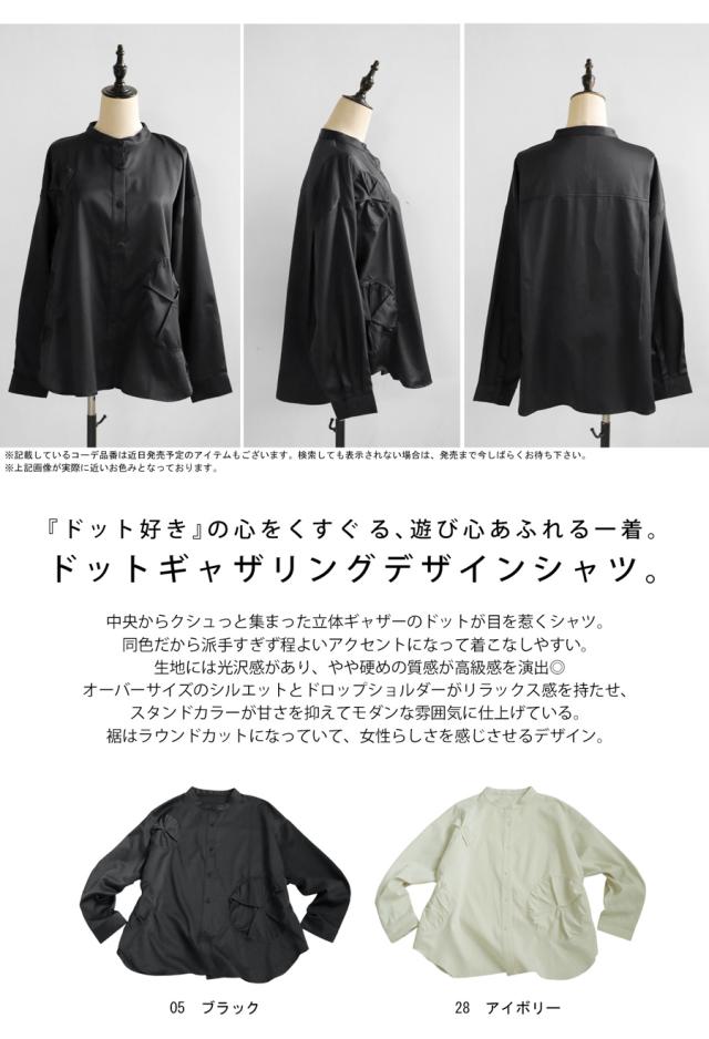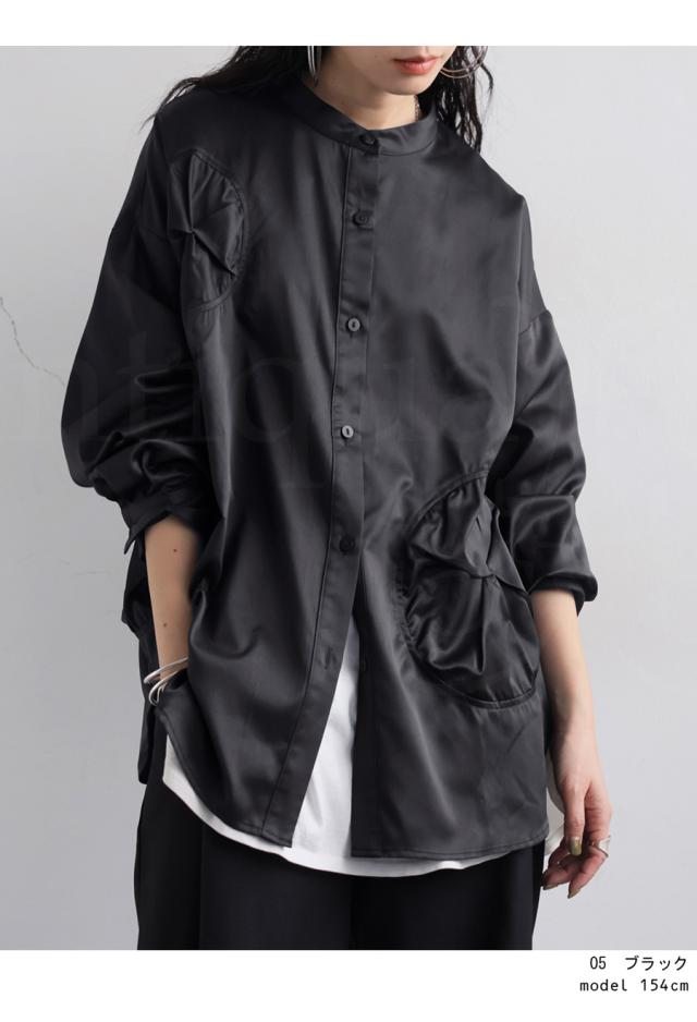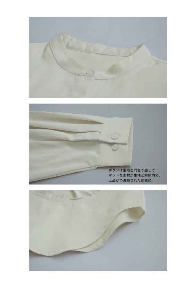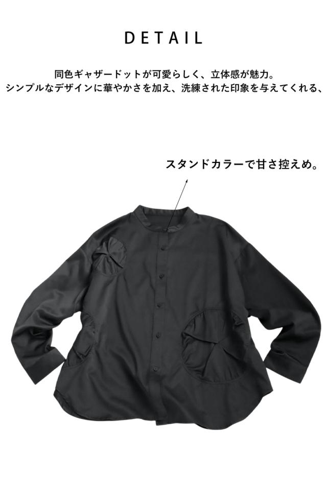 pk-01247 トップス 長袖 無地 ブラウス ゆったり スタンドカラ— バンドカラ— ドットギャザー ニュアンス 前開き ボタン ラウンド裾 光沢感 甘さ控えめ ヨーク 高級感 落ち感 モード