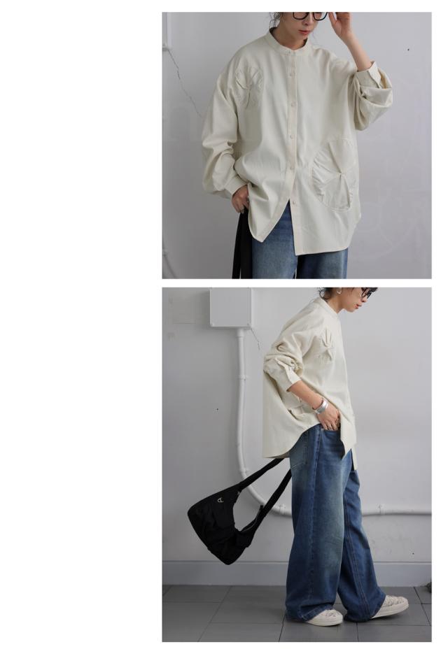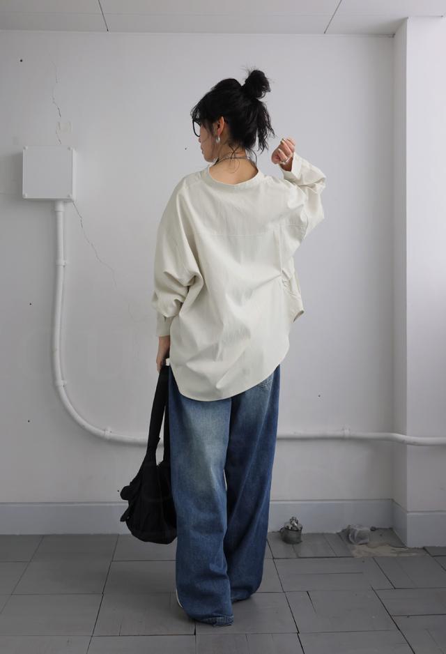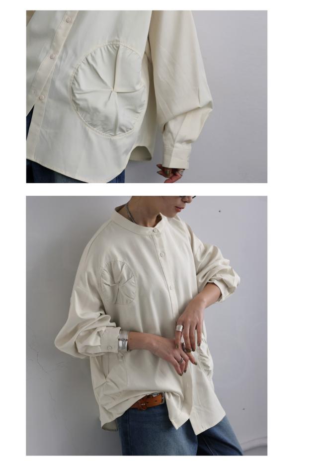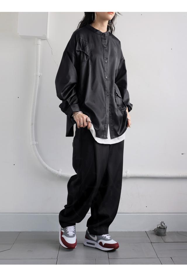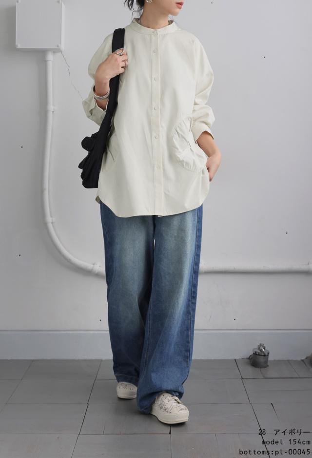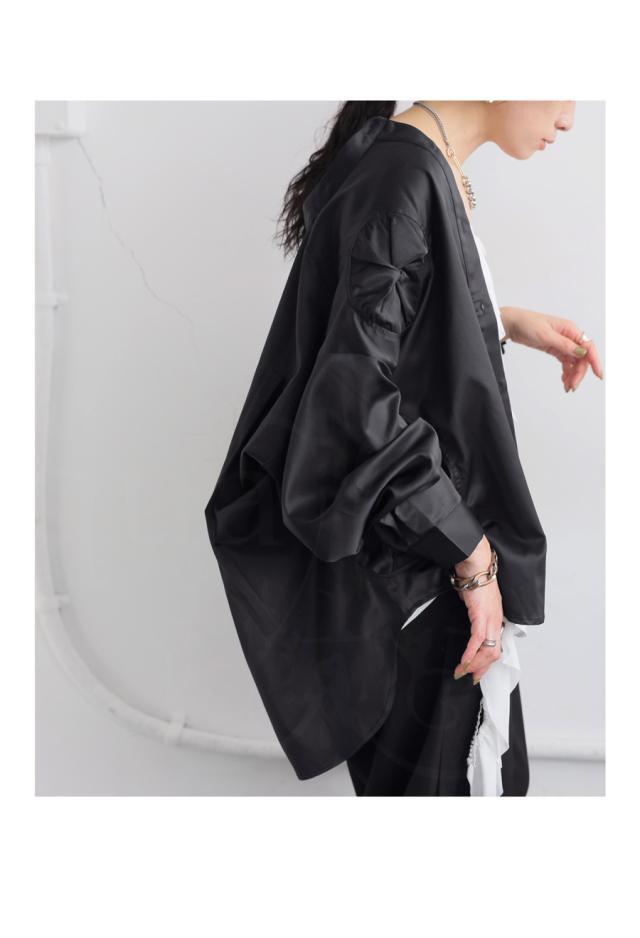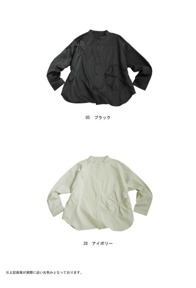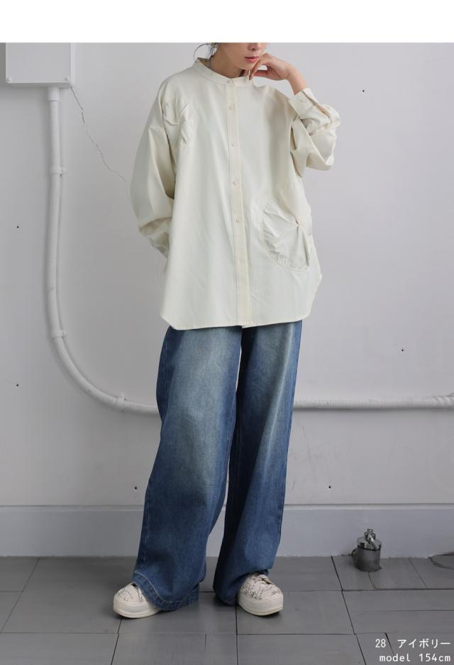 pk-01247 トップス 長袖 無地 ブラウス ゆったり スタンドカラ— バンドカラ— ドットギャザー ニュアンス 前開き ボタン ラウンド裾 光沢感 甘さ控えめ ヨーク 高級感 落ち感 モード
